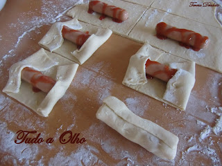 Enrole cada triângulo do sentido do mais largo para o bico, para formar o croissant.